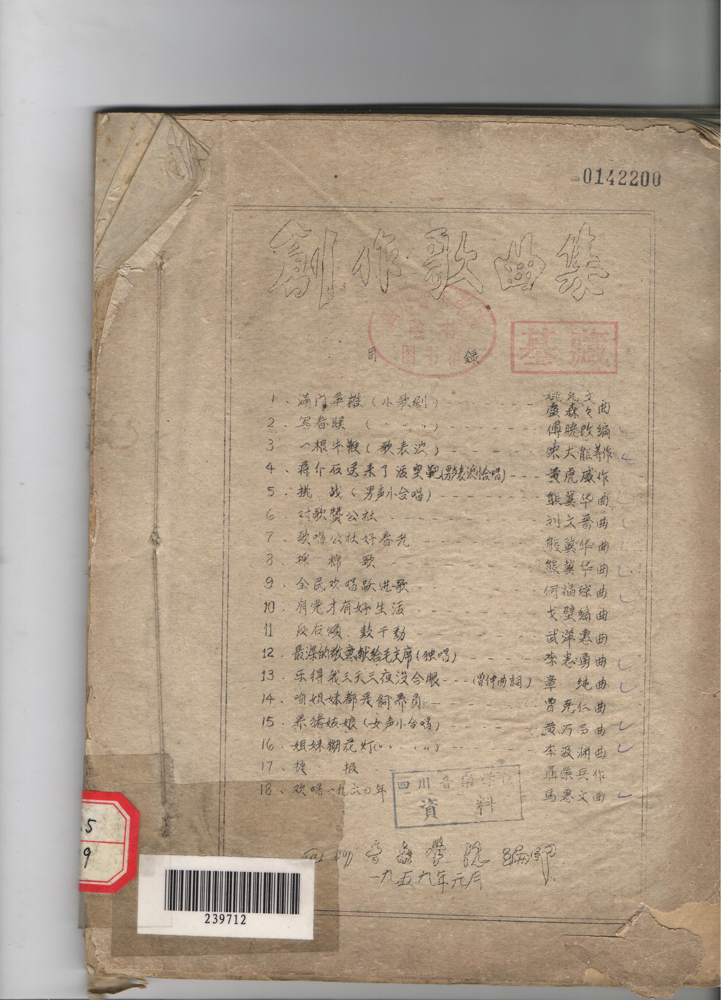 四川音乐学院1956年编印的此书。其中收录了18首收歌曲。包括黄虎威的《蒋介石送来了活空靶》、熊冀华《歌唱公社好时光》《挑战》李忠勇《最深的敬意献给毛主席》、章纯《乐的我三天三夜没合眼》等等歌曲。