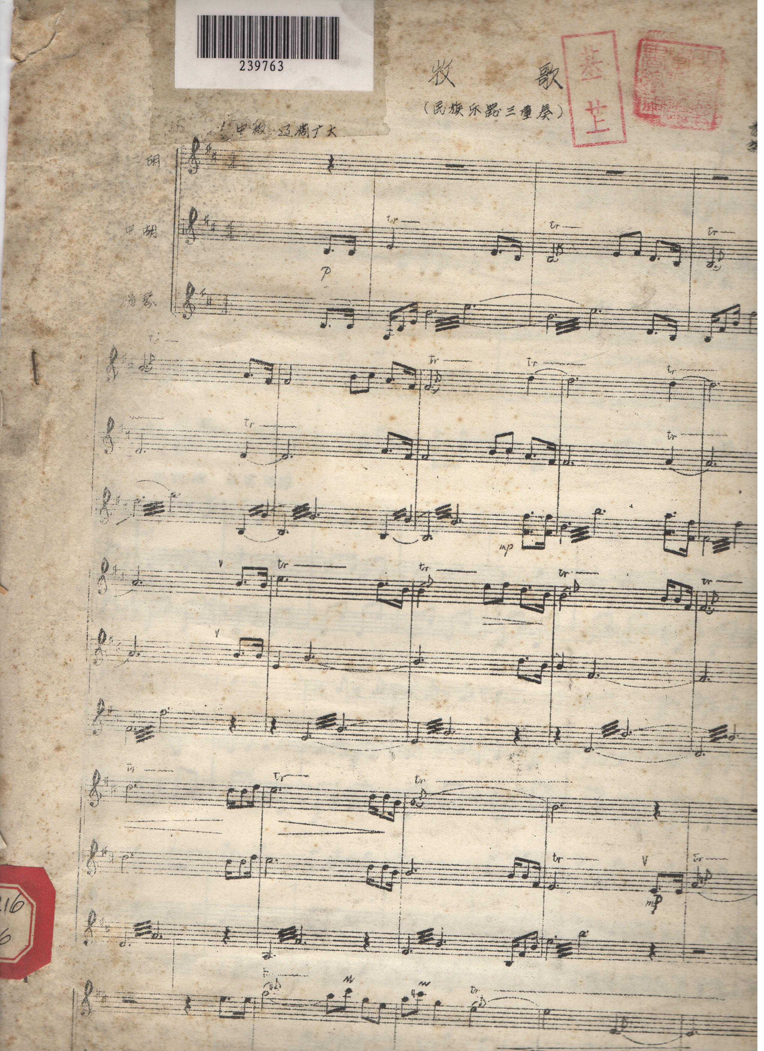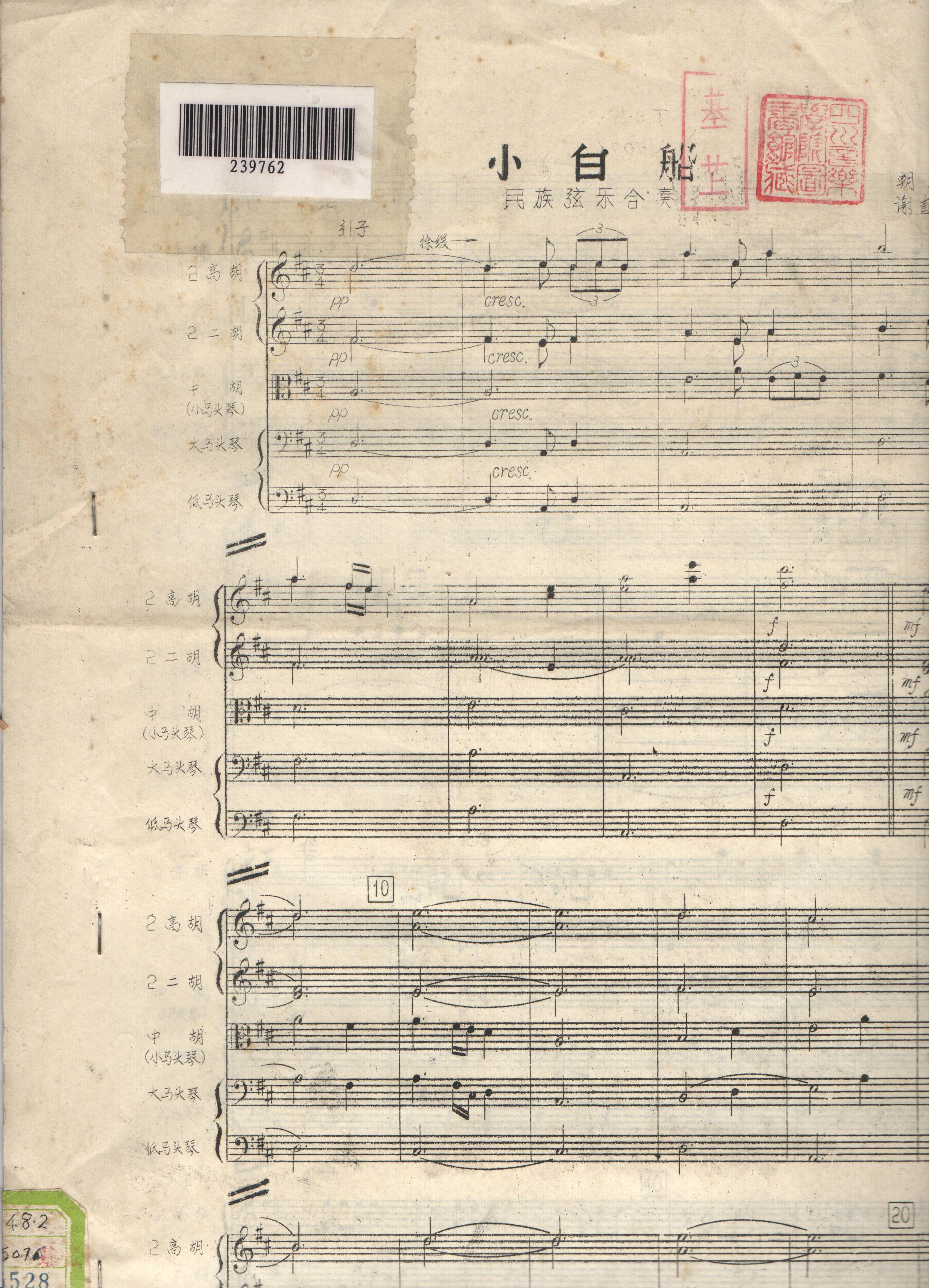 谢直心根据朝鲜童谣编曲的民族弦乐合奏曲《小白船》。
