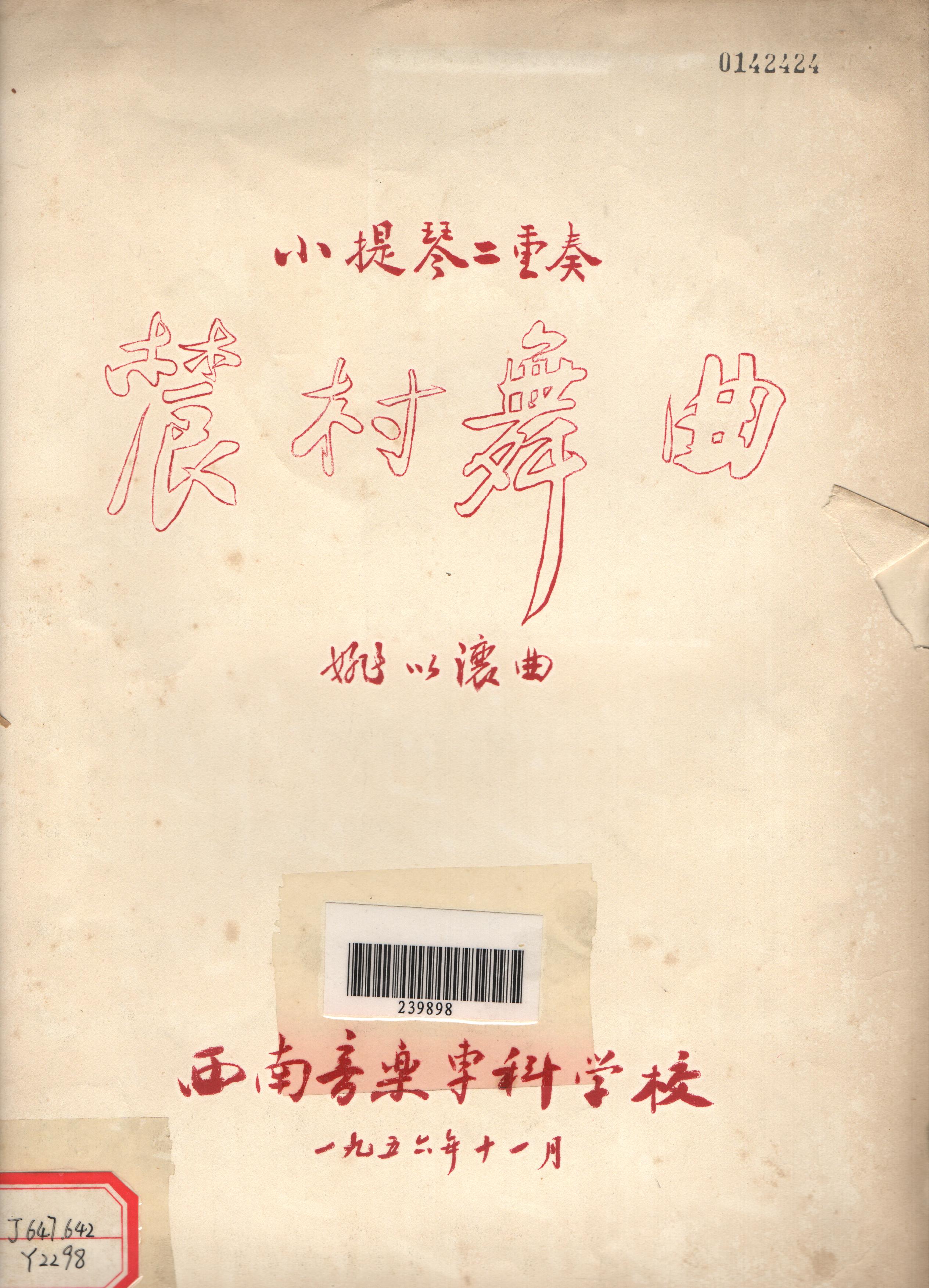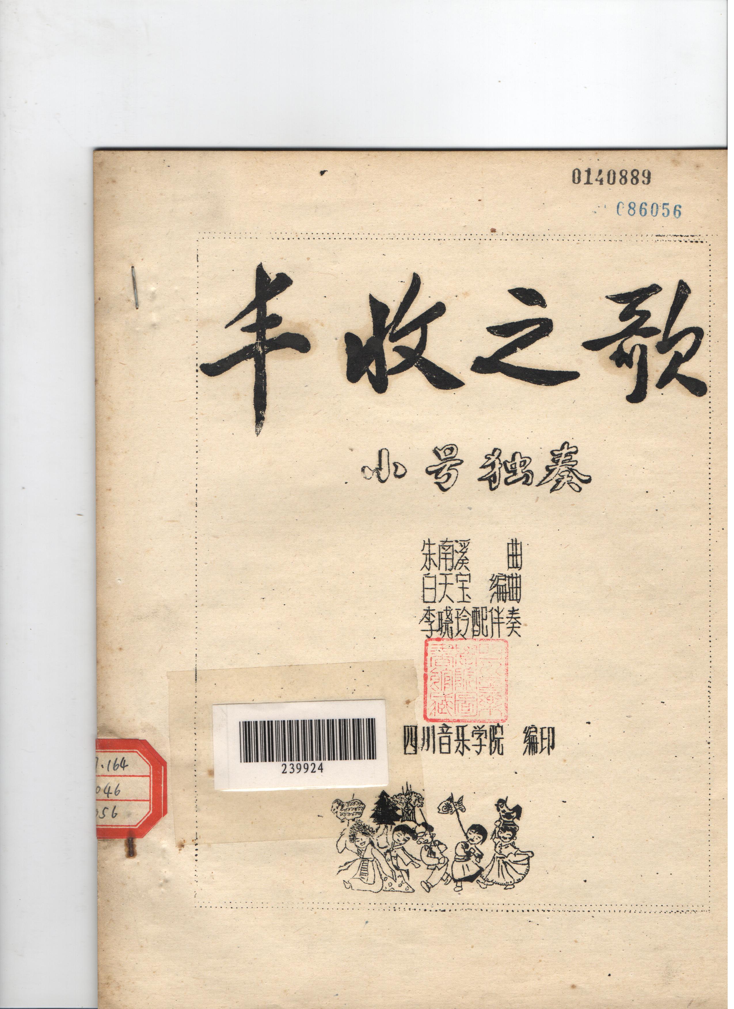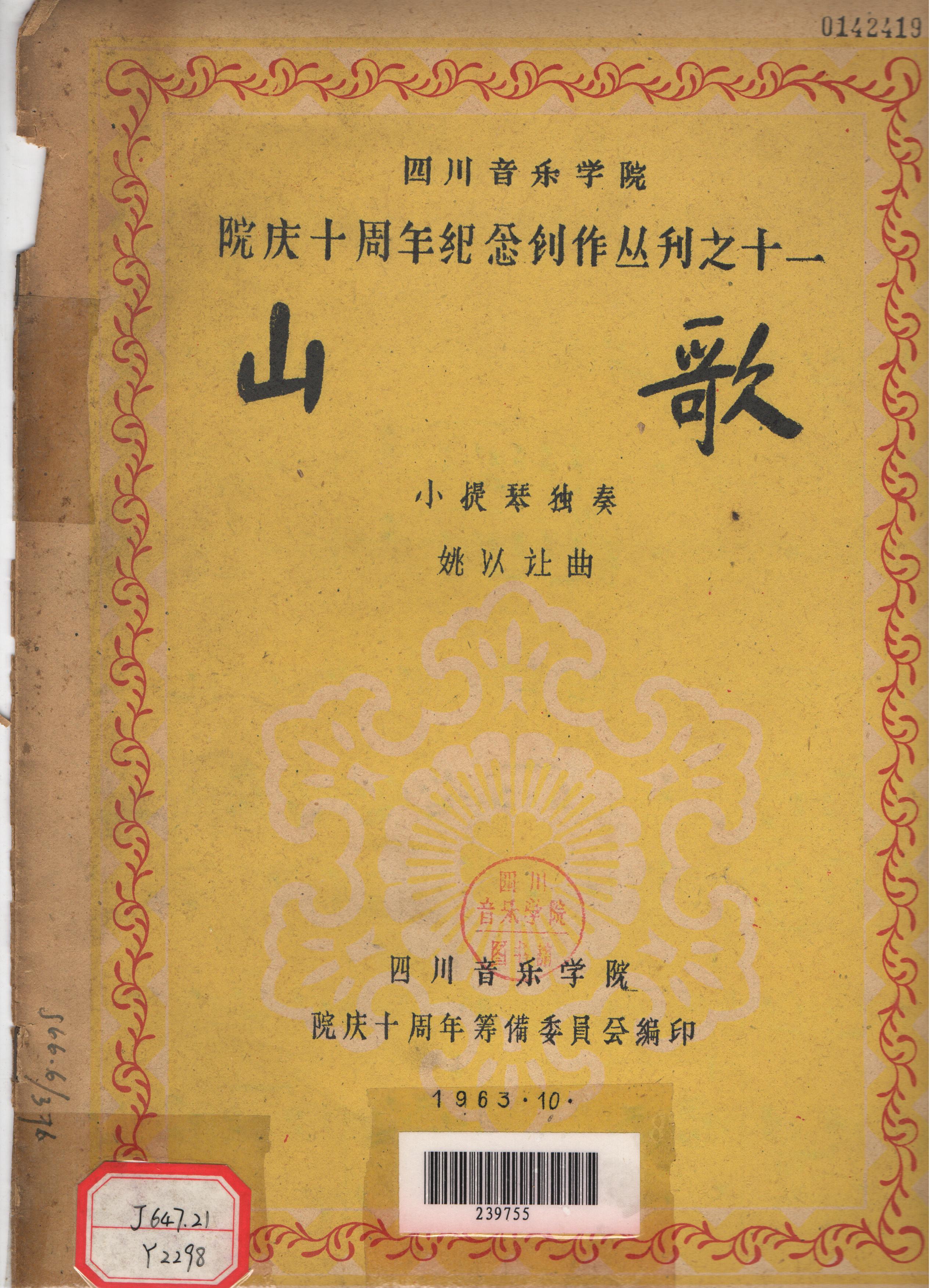 姚以让曲,四川音乐学院院庆十周年筹备委员会编印的小提琴独奏曲谱《山歌》。