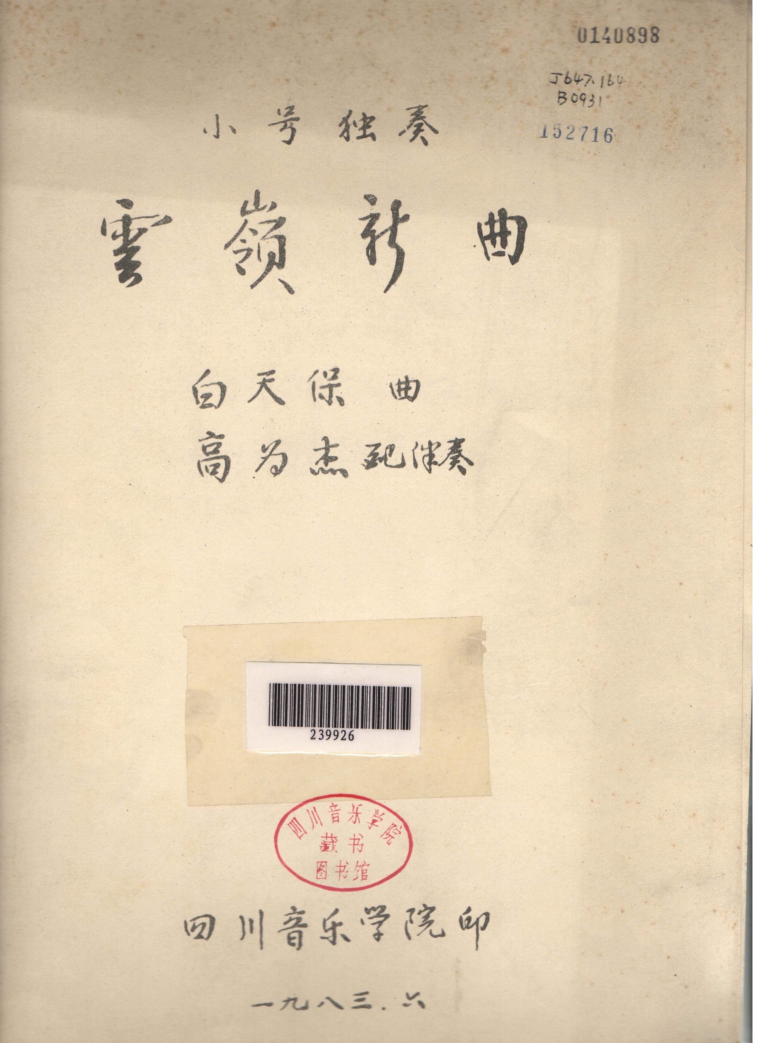 由白天保作曲,高为杰配伴奏的小号独奏曲目《云岭新曲》。