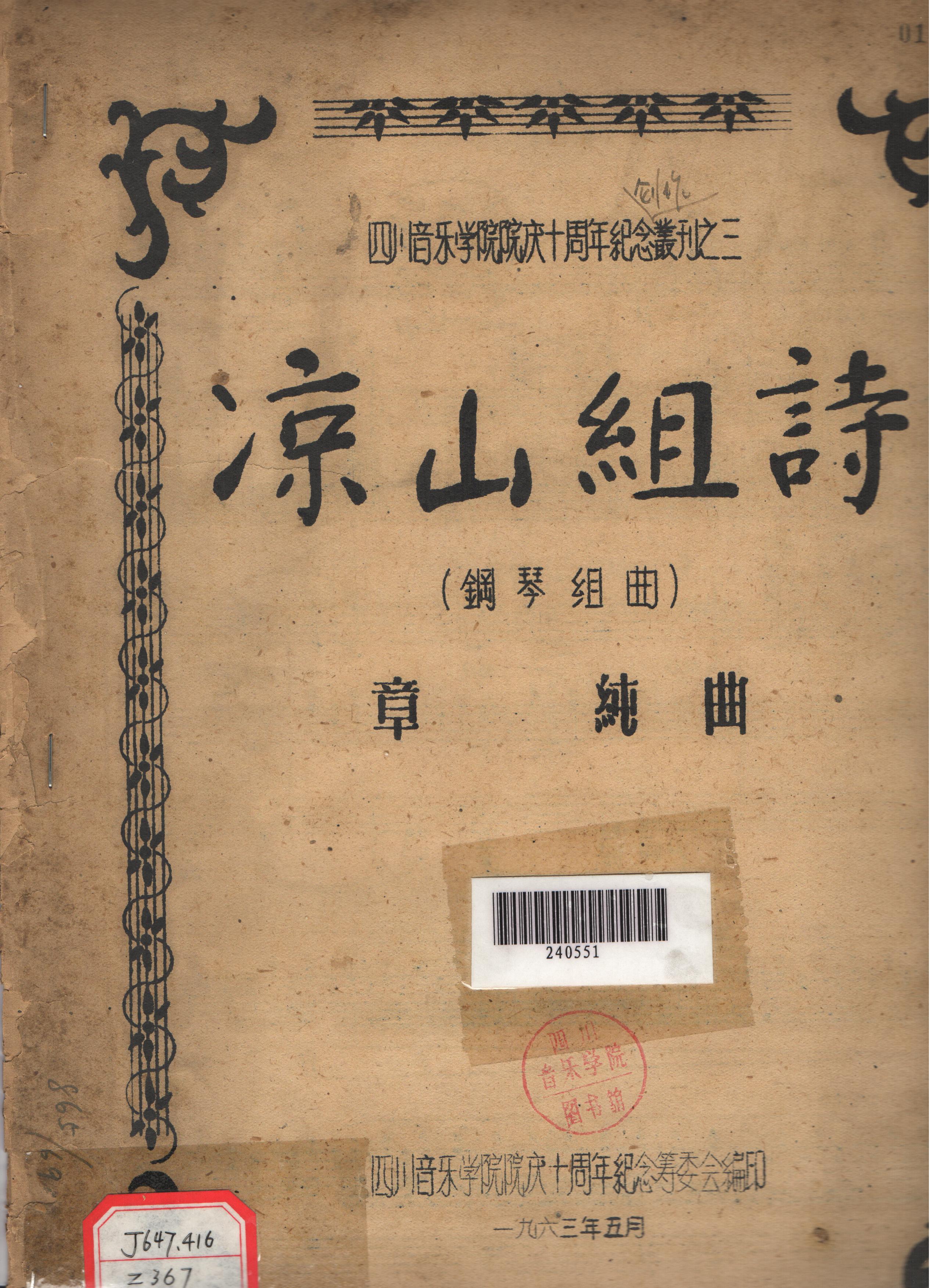 章纯曲,由四川音乐学院院庆十周年纪念筹委会编印。包括曲目有《依龙拉达》《快乐的猎人》《阿惹妞》《烈士墓》