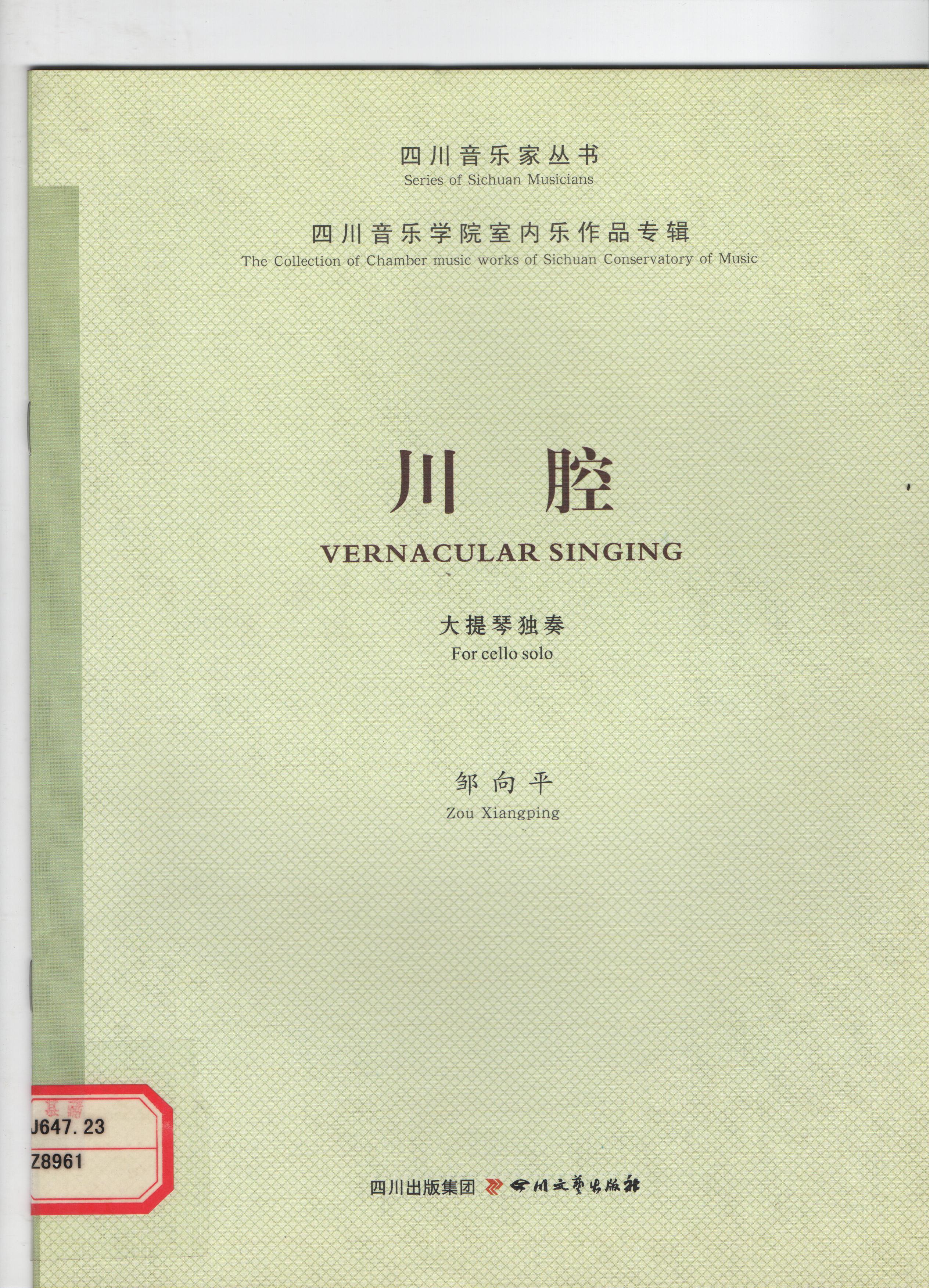 邹向平编著的大提琴独奏曲《川腔》。该作品是邹向平教授在川剧的戏腔音调,表演,韵白,帮腔,曲牌变化,打击乐,戏装,戏脸中获得灵感创作的带有川剧情调的一个作品。