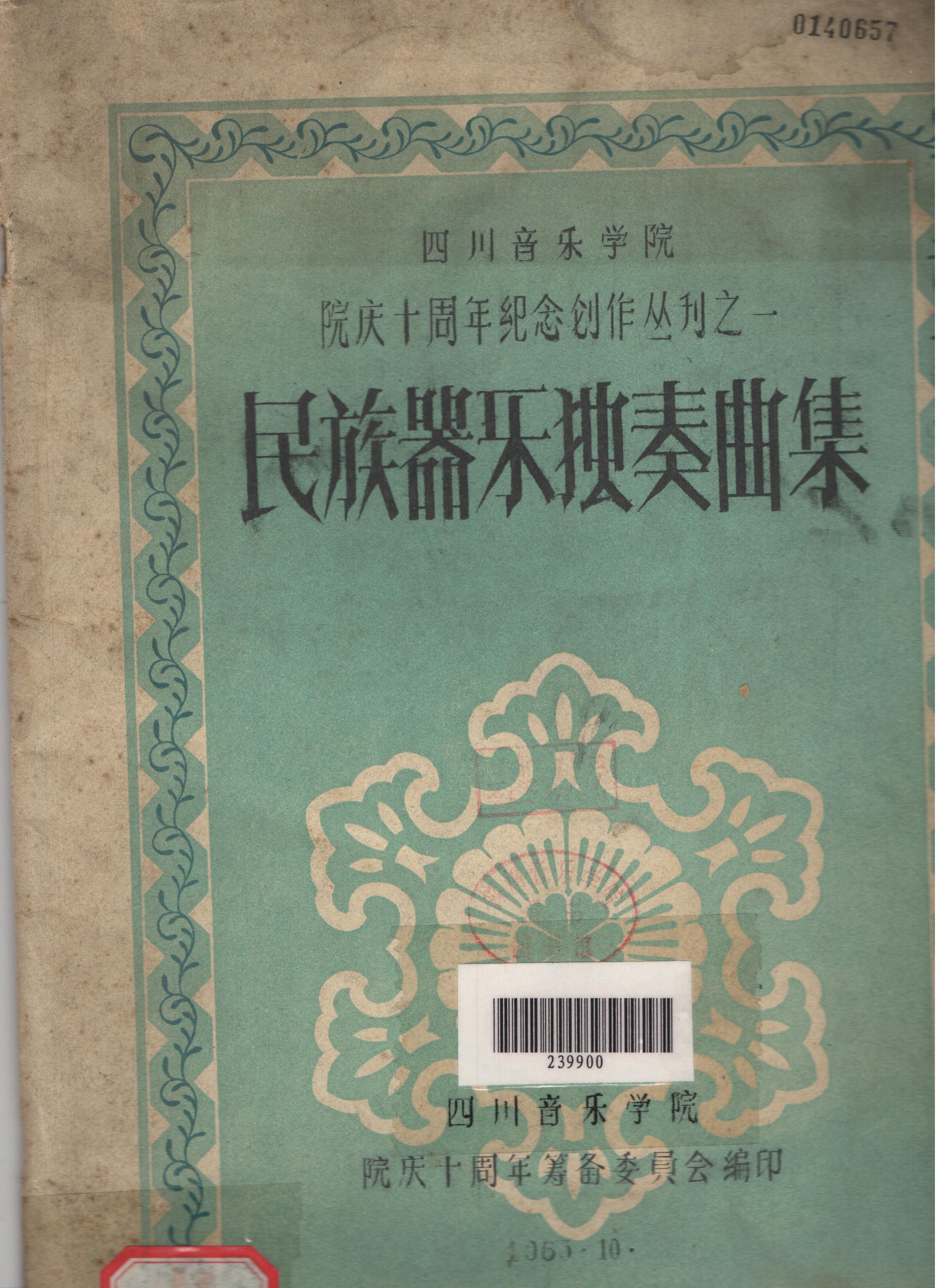 我院在1963年10月院庆十周年筹备委员会编印额《民族器乐独奏曲集》共收录了十首曲子其中包括张敬聪创作的笛子独奏,乐队伴奏《骆驼队》、陈富民创作的扬琴独奏曲《托江畔》=黄仁远创作的笛子独奏《送公粮》、郑德智创作的二胡独奏曲《家乡啊,如今你多美丽》、顾培幼创作的琵琶独奏曲《纺织姑娘》、马杰 二胡独奏《信天游》、潘广德 扬琴独奏曲《满山春》、田耕时古筝独奏曲《雁》、陈泽 二胡独奏曲《洱源夜曲》。